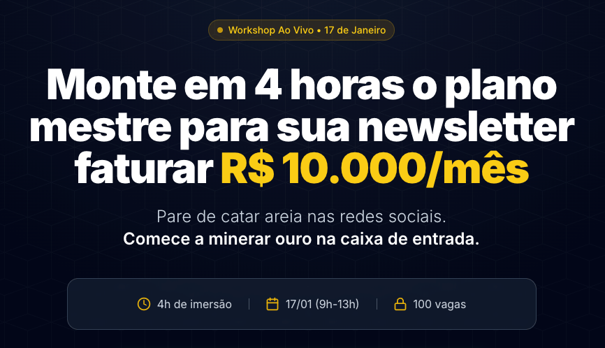 Se você quer estruturar sua newsletter usando o mesmo sistema que criadores e empresas usam para gerar resultados consistentes, preparamos uma aula AO VIVO completa. Veja abaixo os detalhes do Workshop.